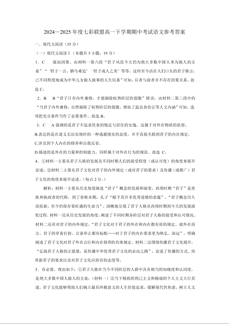 湖北省武汉市部分省级示范高中2024-2025学年下学期4月高一期中测试语文答案