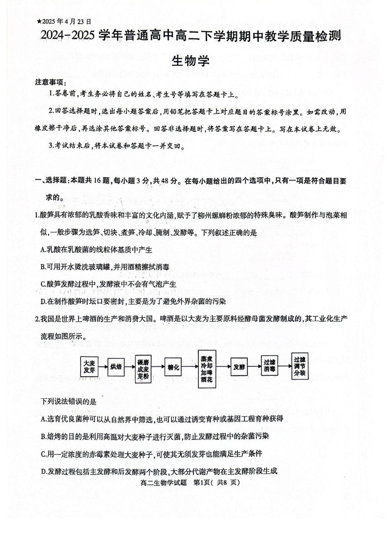 河南省信阳市2024-2025学年下学期4月高一期中考试生物+答案