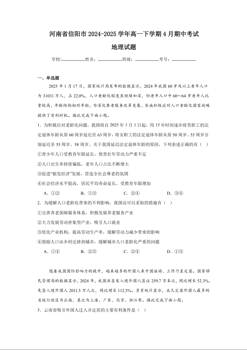 河南省信阳市2024-2025学年下学期4月高一期中考试地理+答案