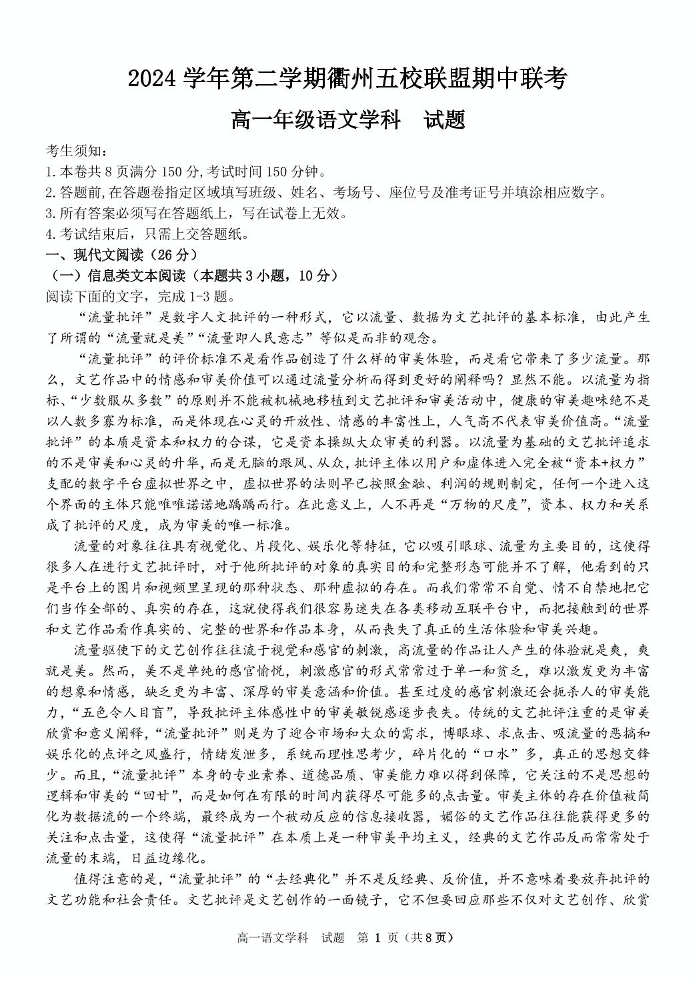 浙江省衢州市五校联盟2024-2025学年下学期高一期中考试语文+答案