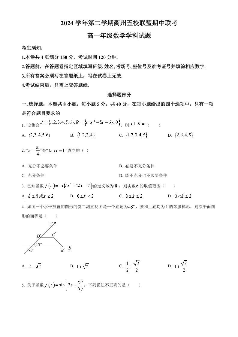 浙江省衢州市五校联盟2024-2025学年下学期高一期中考试数学+答案