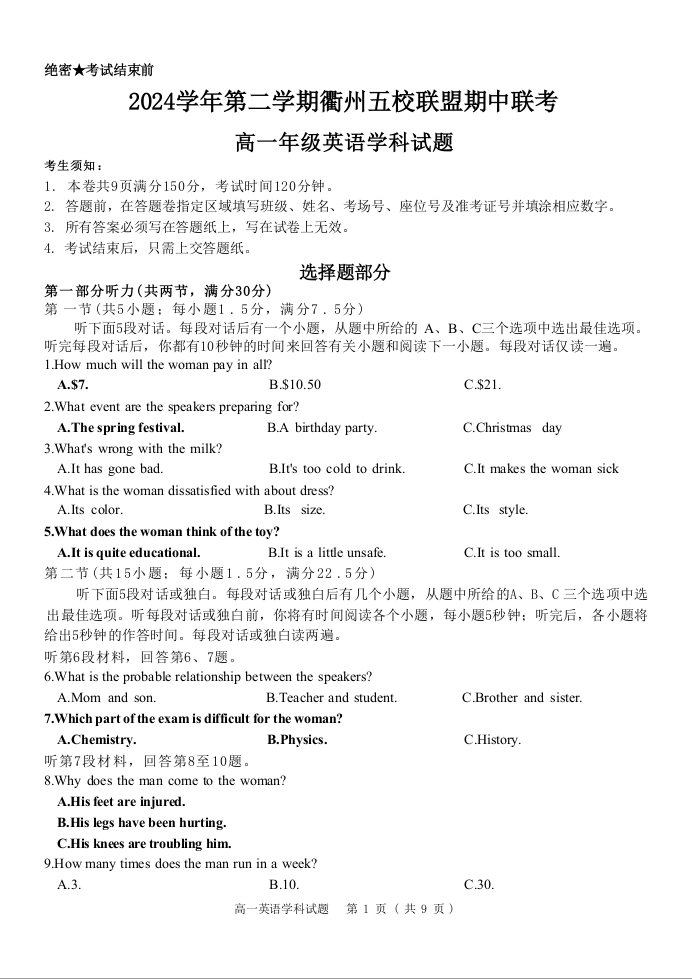 浙江省衢州市五校联盟2024-2025学年下学期高一期中考试英语
