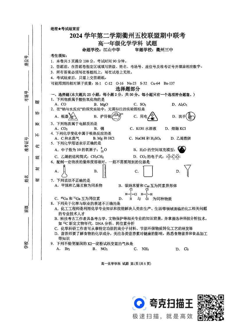浙江省衢州市五校联盟2024-2025学年下学期高一期中考试化学