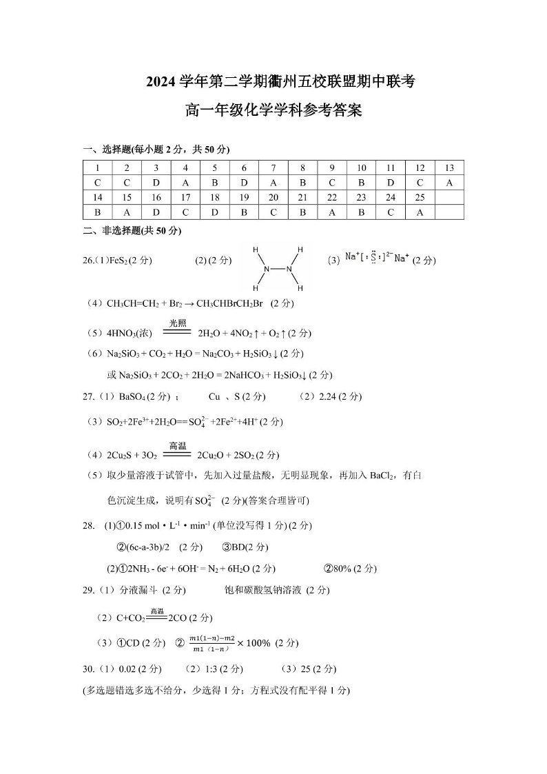 浙江省衢州市五校联盟2024-2025学年下学期高一期中考试化学答案