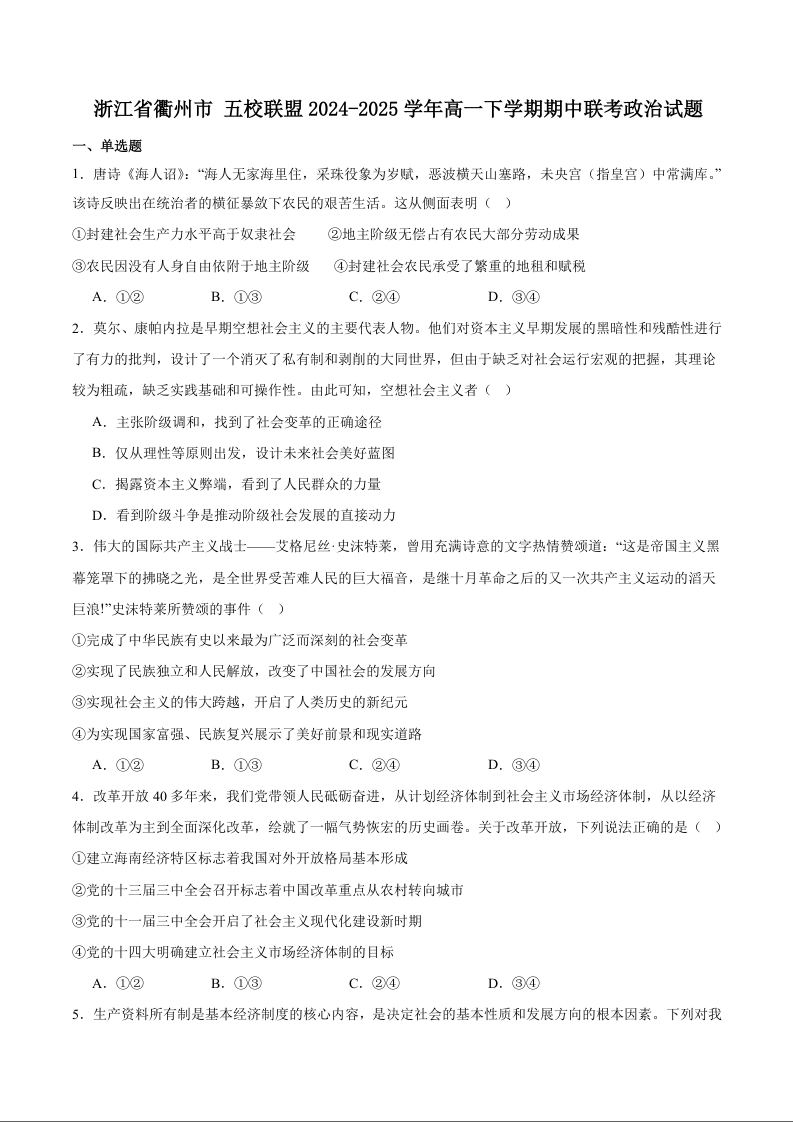 浙江省衢州市五校联盟2024-2025学年下学期高一期中考试政治+答案