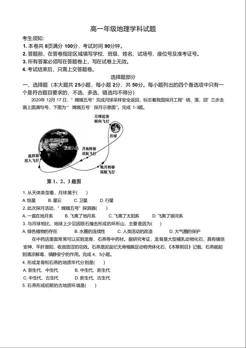 浙江省衢州市五校联盟2024-2025学年下学期高一期中考试地理+答案