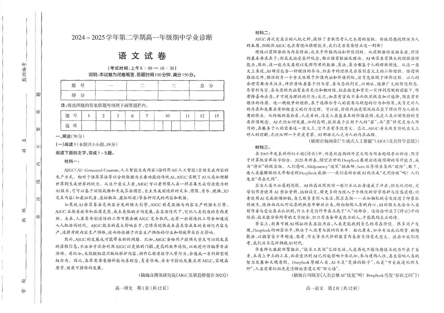 山西省太原市2024-2025学年下学期高一期中考试语文+答案