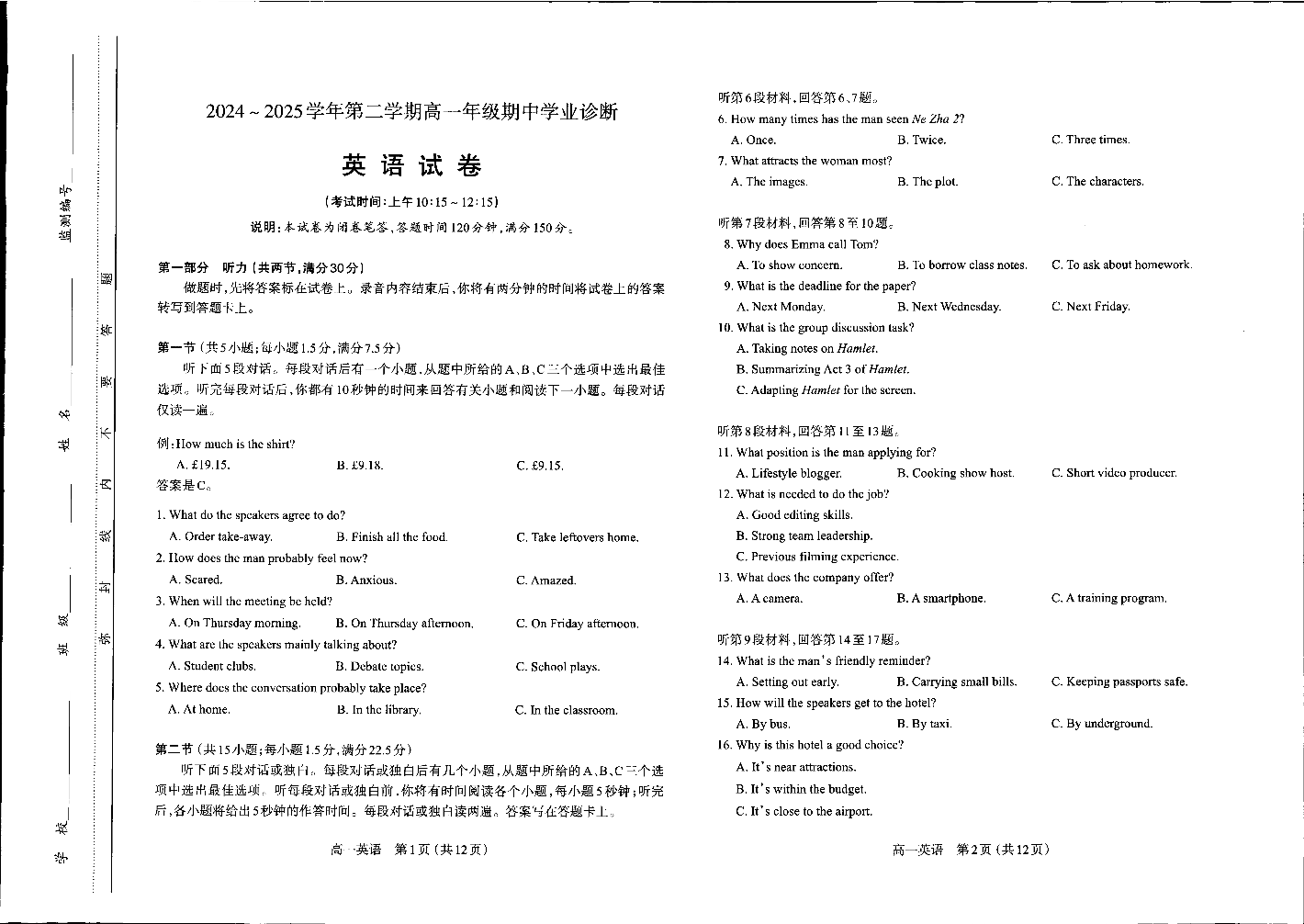 山西省太原市2024-2025学年下学期高一期中考试英语+答案