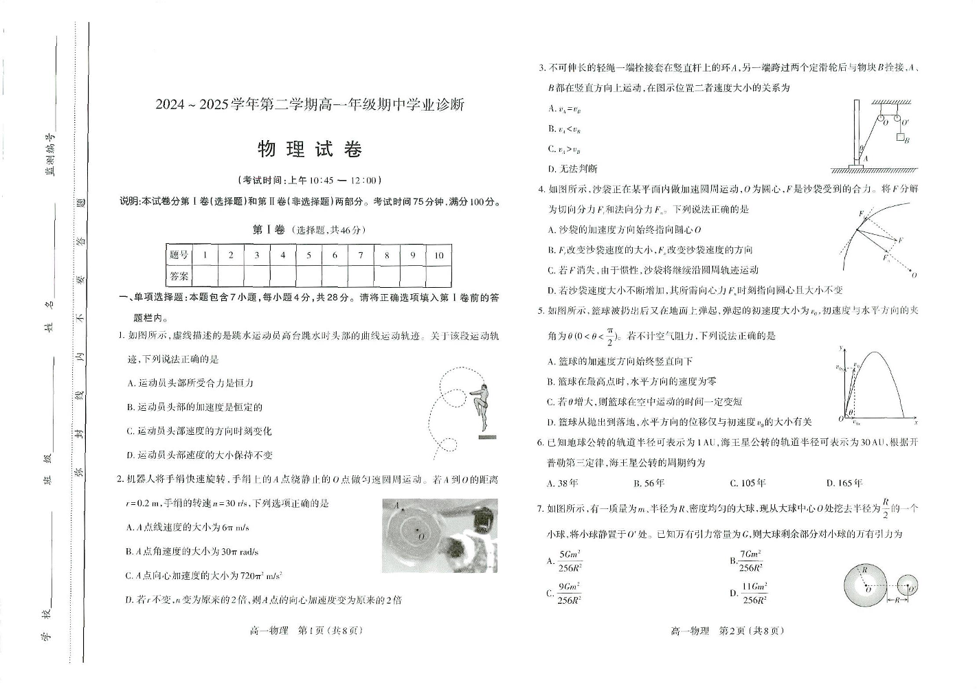 山西省太原市2024-2025学年下学期高一期中考试物理+答案