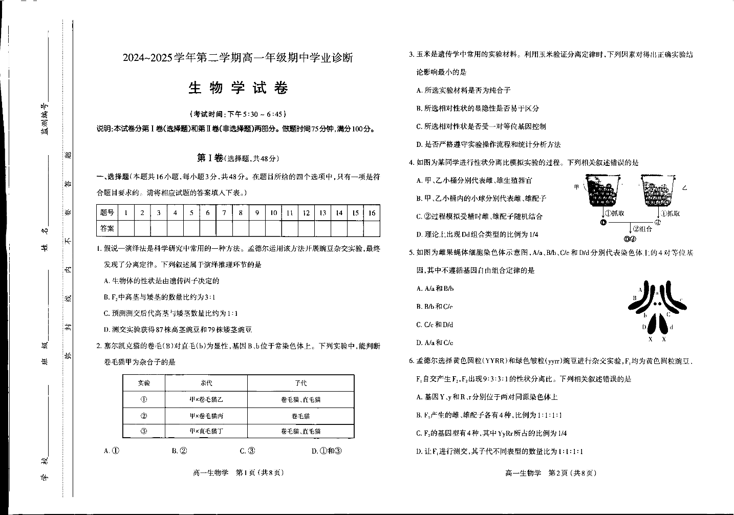 山西省太原市2024-2025学年下学期高一期中考试生物+答案