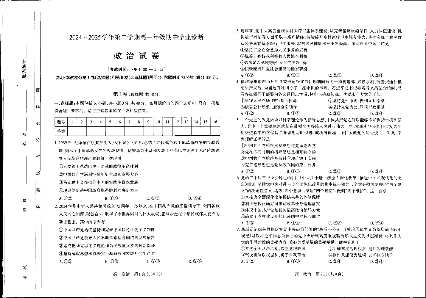 山西省太原市2024-2025学年下学期高一期中考试政治+答案