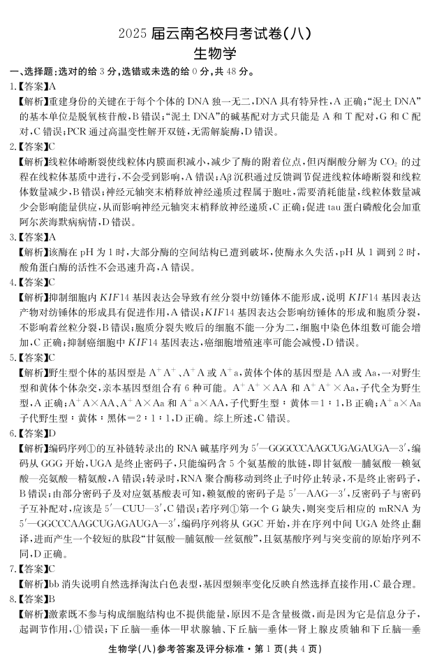 云南省名校联盟2024-2025学年下学期高三月考(八)生物答案