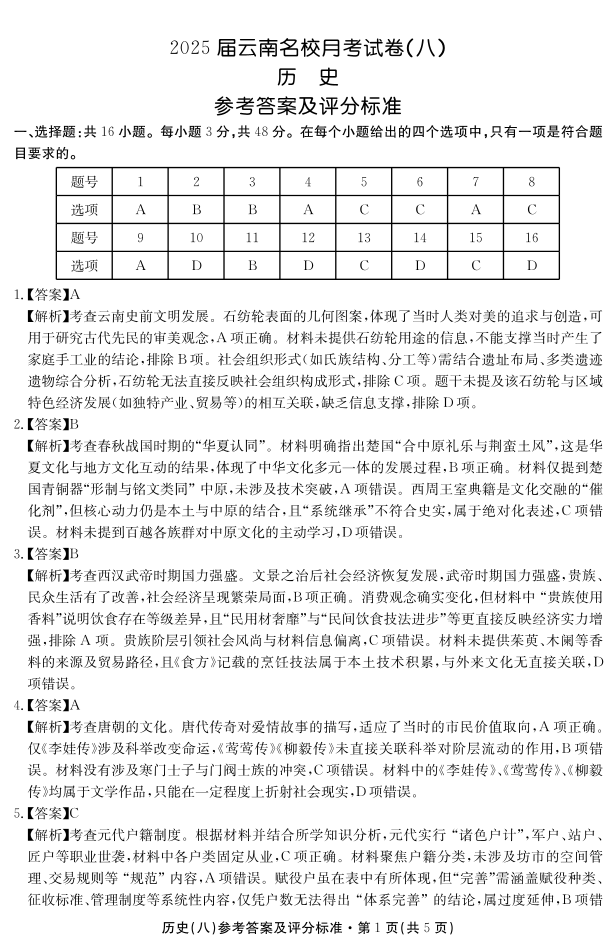 云南省名校联盟2024-2025学年下学期高三月考(八)历史答案