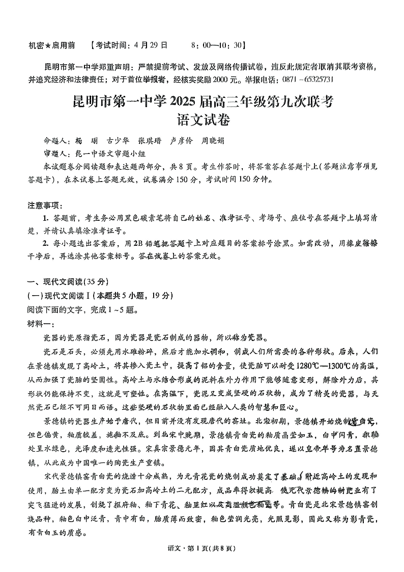 云南省昆明市一中2024-2025学年高三年级九次联考语文+答案