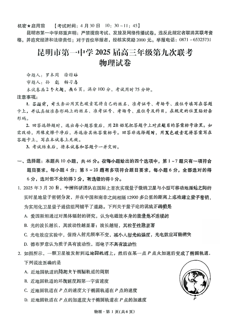 云南省昆明市一中2024-2025学年高三年级九次联考物理+答案
