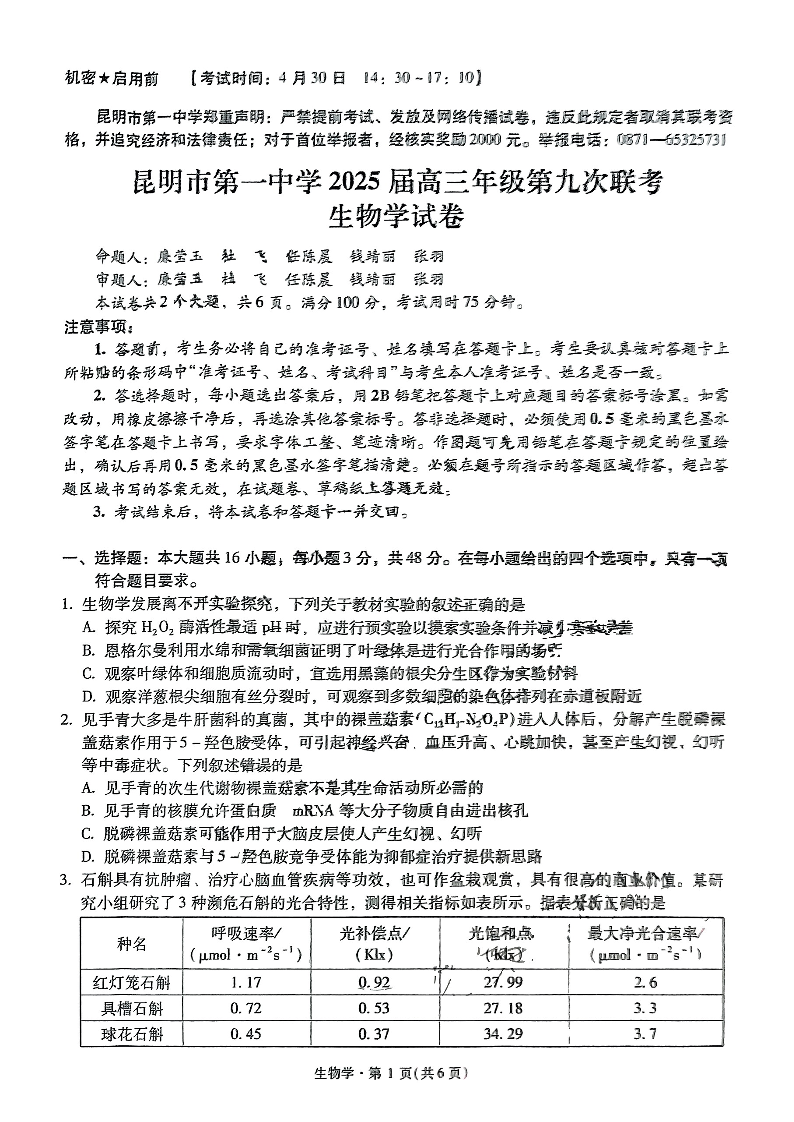 云南省昆明市一中2024-2025学年高三年级九次联考生物+答案