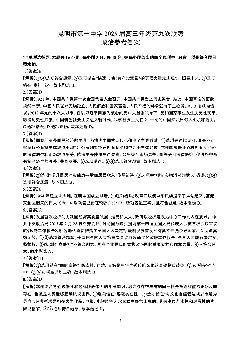 云南省昆明市一中2024-2025学年高三年级九次联考政治答案