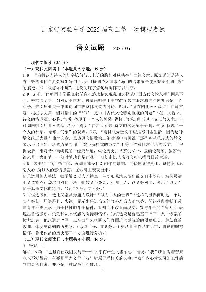 山东省实验中学2024-2025学年下学期高三第一次模拟考试语文答案
