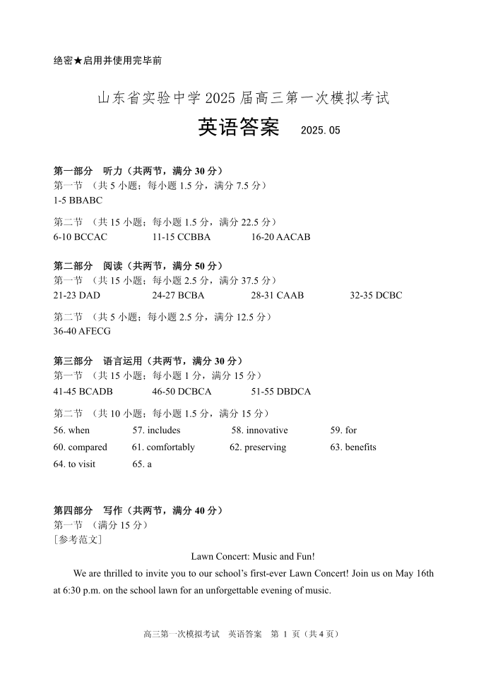 山东省实验中学2024-2025学年下学期高三第一次模拟考试英语答案