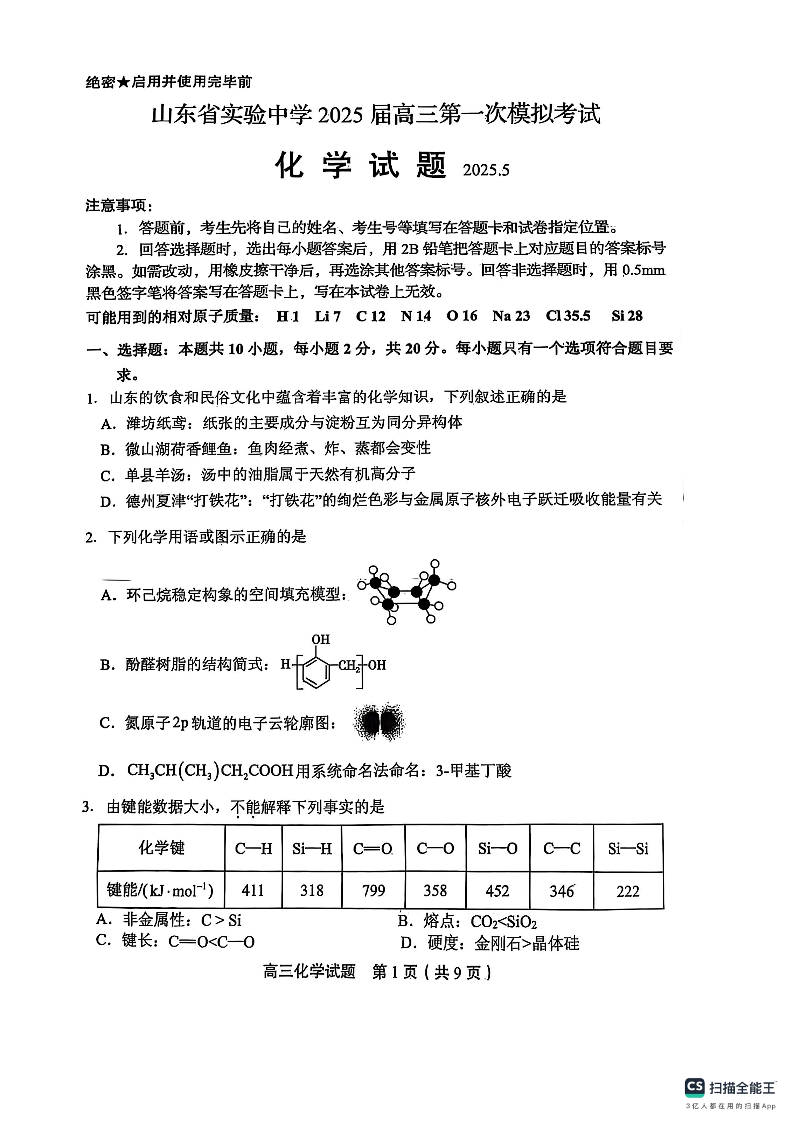 山东省实验中学2024-2025学年下学期高三第一次模拟考试化学