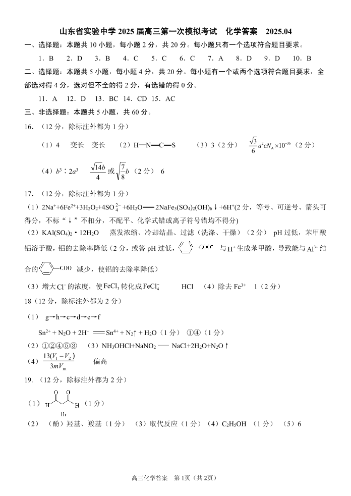 山东省实验中学2024-2025学年下学期高三第一次模拟考试化学答案