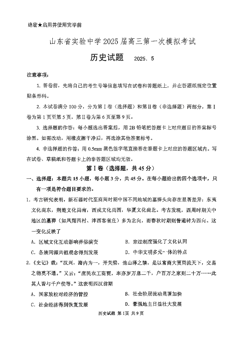 山东省实验中学2024-2025学年下学期高三第一次模拟考试历史