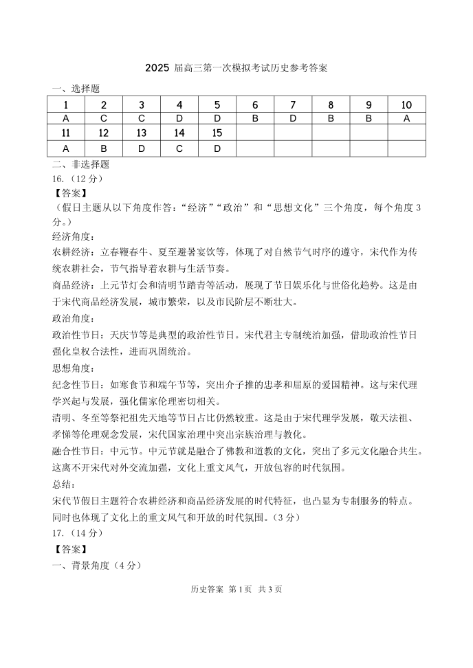 山东省实验中学2024-2025学年下学期高三第一次模拟考试历史答案