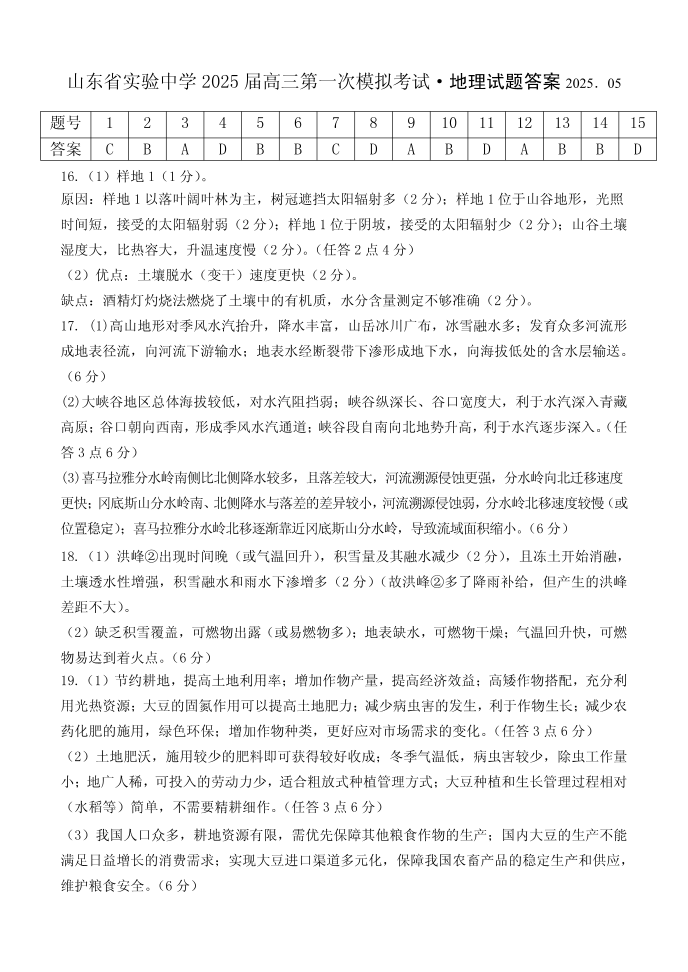 山东省实验中学2024-2025学年下学期高三第一次模拟考试地理答案