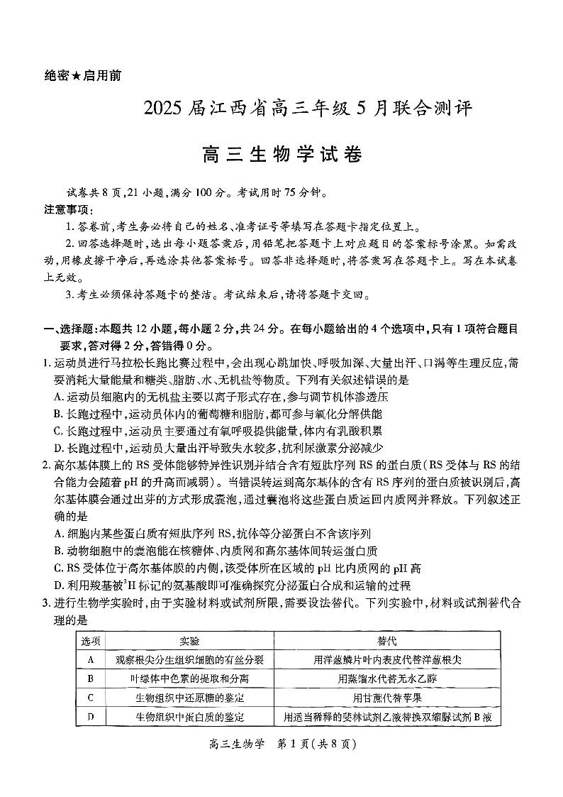 江西省稳派上进联考2024-2025学年下学期5月高三联合测评生物