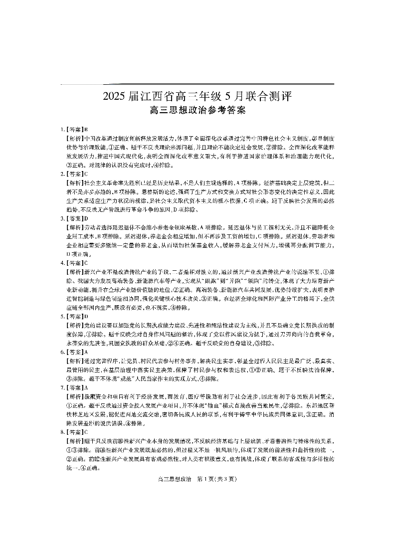 江西省稳派上进联考2024-2025学年下学期5月高三联合测评政治答案