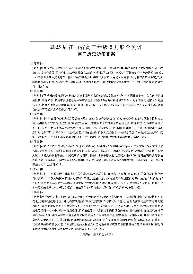 江西省稳派上进联考2024-2025学年下学期5月高三联合测评历史答案