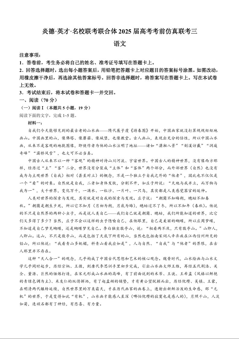 湖南·名校联考联合体2024-2025学年高三高考考前仿真联考二语文+答案