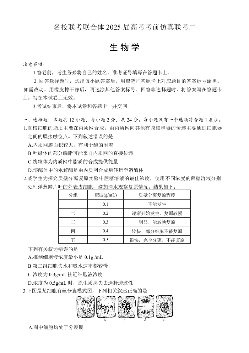 湖南·名校联考联合体2024-2025学年高三高考考前仿真联考二生物+答案