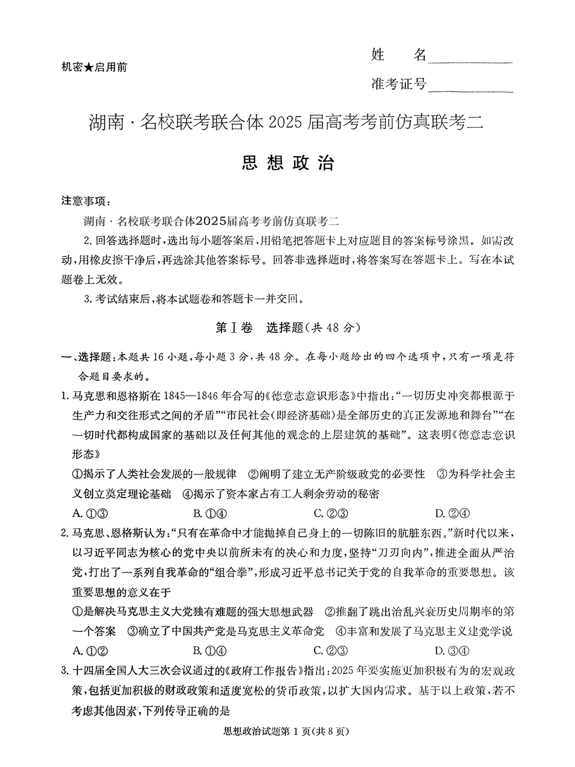 湖南·名校联考联合体2024-2025学年高三高考考前仿真联考二政治