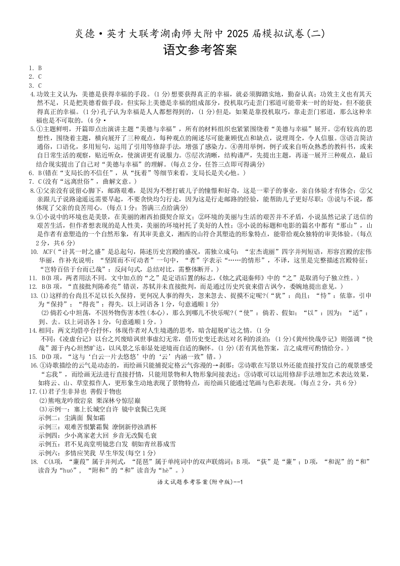 湖南省师大附中2024-2025学年下学期高三模拟考试(二)语文答案