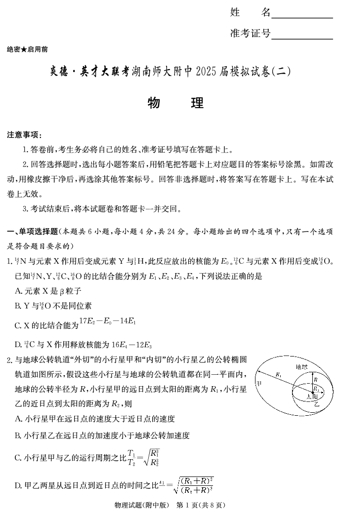 湖南省师大附中2024-2025学年下学期高三模拟考试(二)物理
