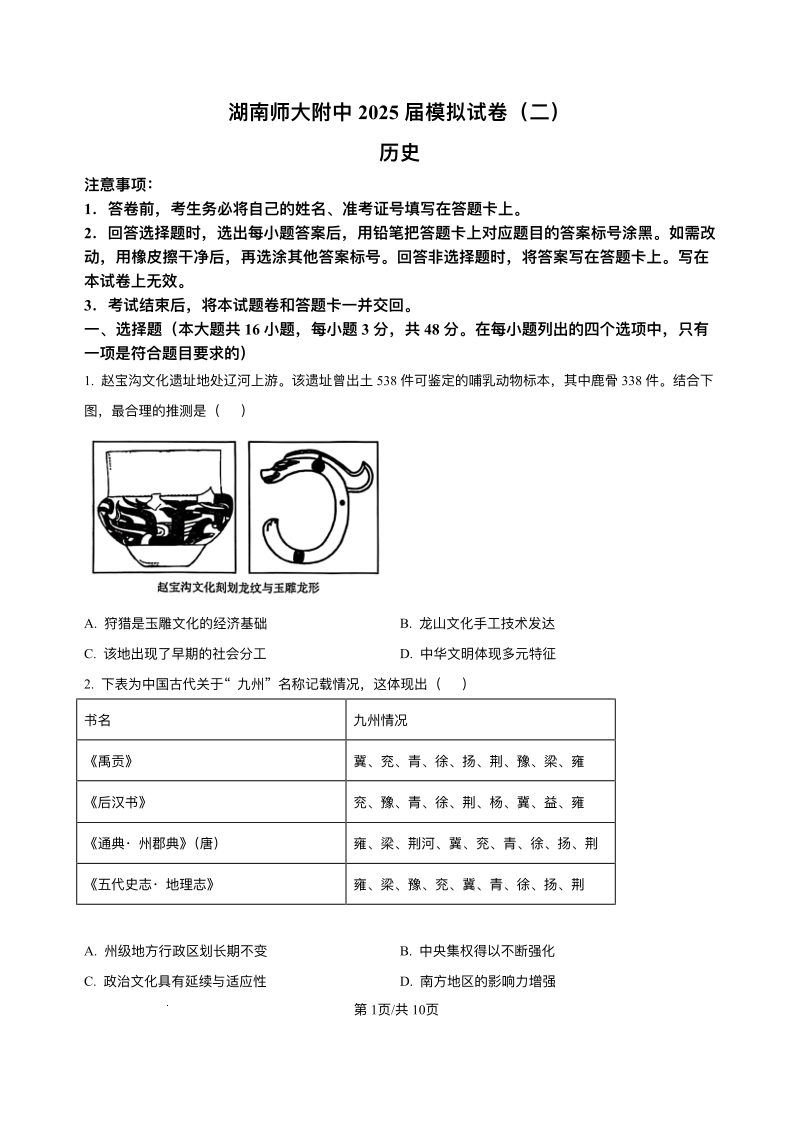 湖南省师大附中2024-2025学年下学期高三模拟考试(二)历史+答案