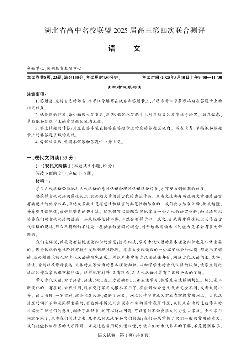 湖北省圆创高中名校联盟2024-2025学年高三第四次联合测评语文