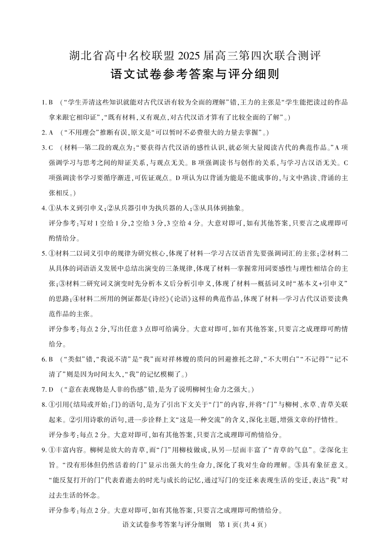 湖北省圆创高中名校联盟2024-2025学年高三第四次联合测评语文答案
