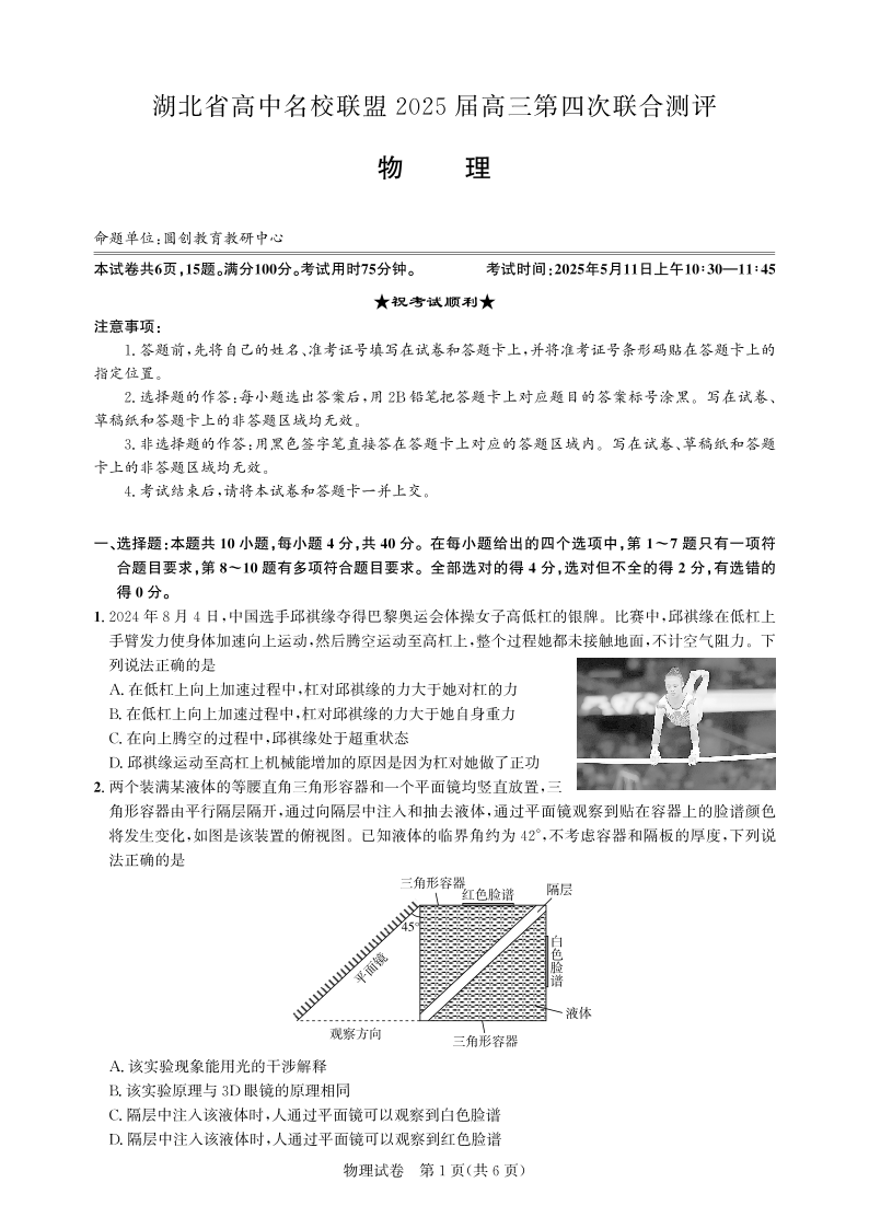 湖北省圆创高中名校联盟2024-2025学年高三第四次联合测评物理