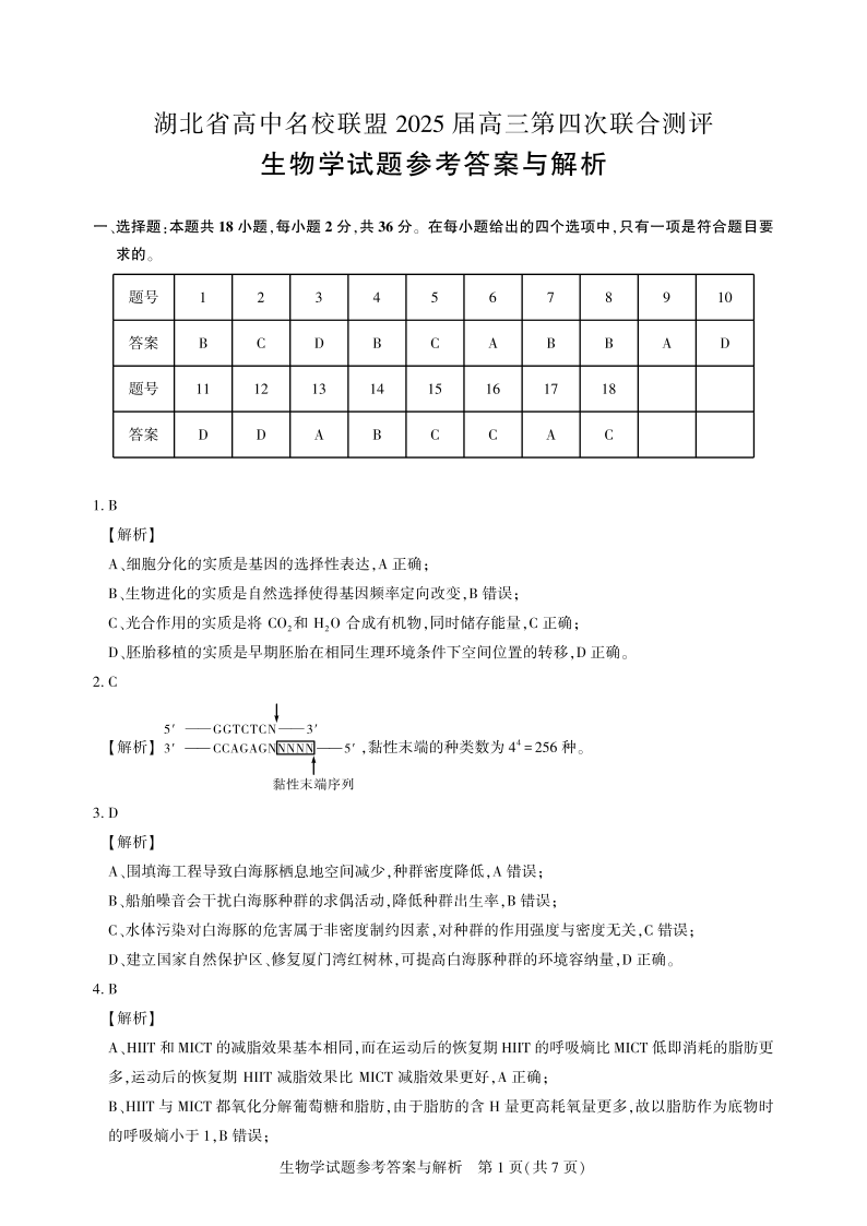 湖北省圆创高中名校联盟2024-2025学年高三第四次联合测评生物答案