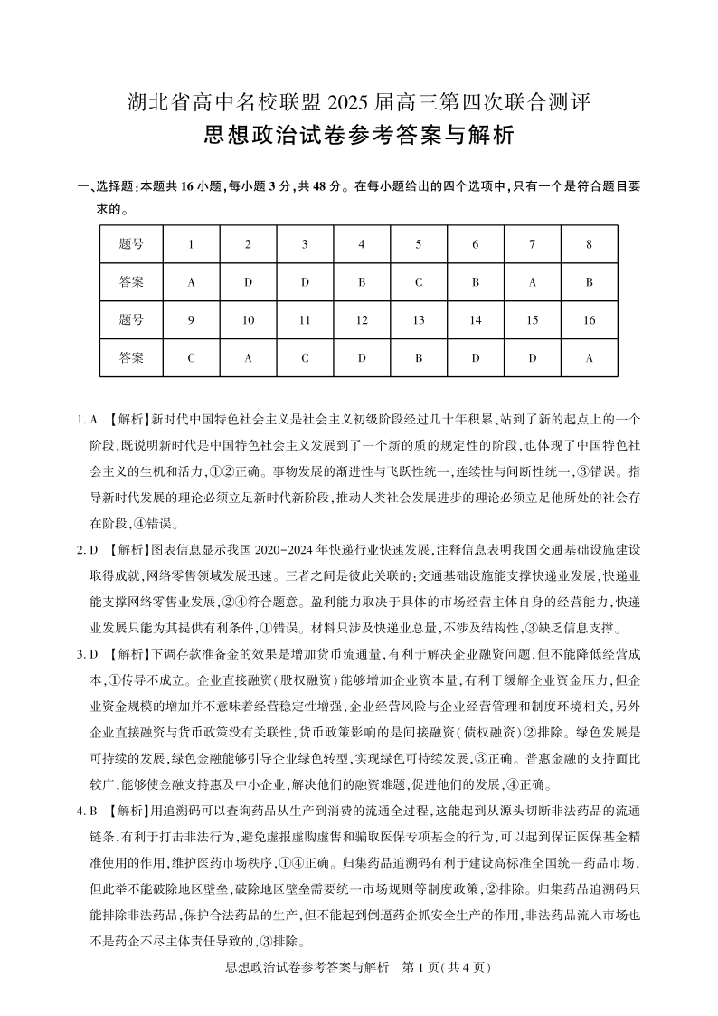 湖北省圆创高中名校联盟2024-2025学年高三第四次联合测评政治答案
