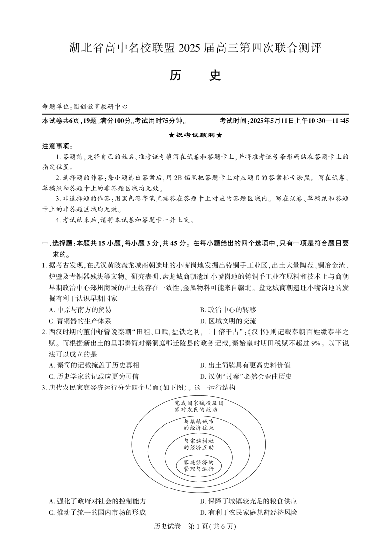 湖北省圆创高中名校联盟2024-2025学年高三第四次联合测评历史