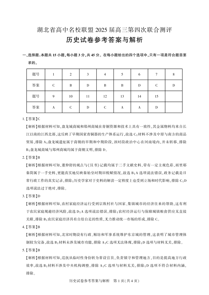 湖北省圆创高中名校联盟2024-2025学年高三第四次联合测评历史答案