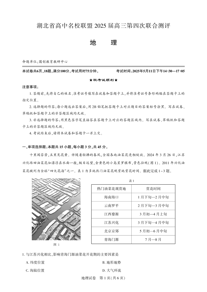 湖北省圆创高中名校联盟2024-2025学年高三第四次联合测评地理