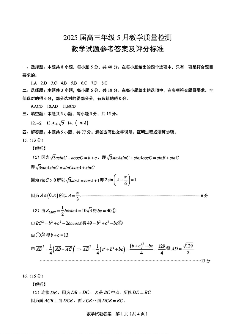 合肥市2024-2025学年下学期5月高三三模教学质量检测数学答案