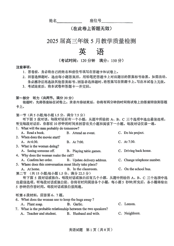 合肥市2024-2025学年下学期5月高三三模教学质量检测英语