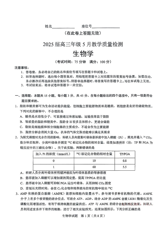 合肥市2024-2025学年下学期5月高三三模教学质量检测生物