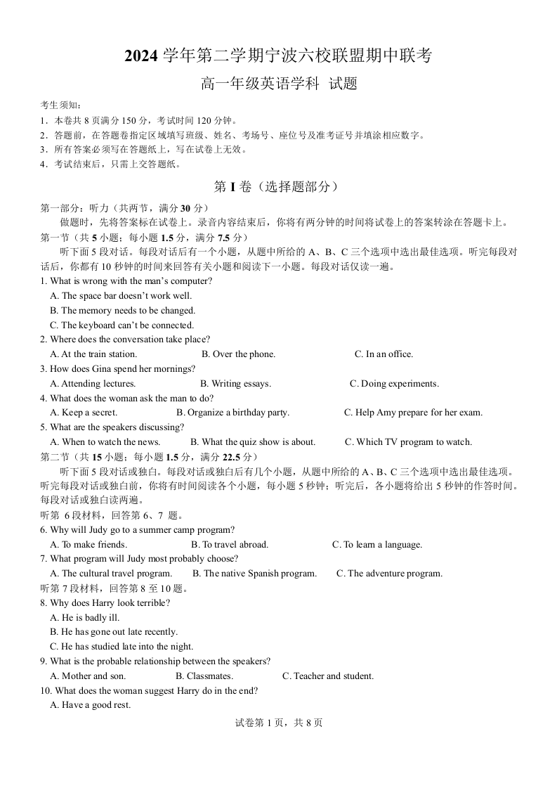 浙江省宁波市六校联盟2024-2025学年下学期高一期中考试英语