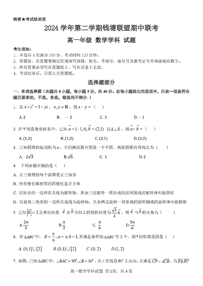 浙江省钱塘联盟2024-2025学年下学期高一期中联考数学+答案